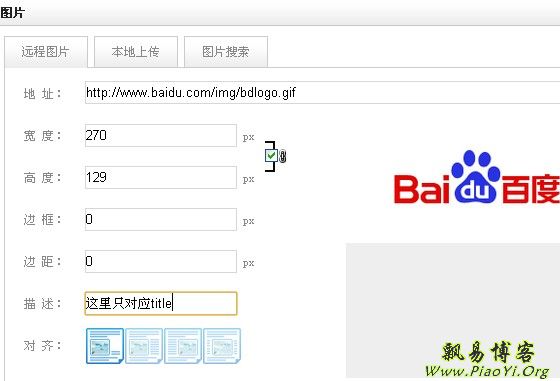 百度的可见即所得编辑ueditor功能不错,但是在插入远程图片时,描述部分仅仅对应图片的title标签,而图片的alt标签并没有设置的地方,大家也许知道对于SEO来说,图片的alt标签非常重要。因此,我们需要为图片增加alt,具体值可以直接设置成和title一样的。